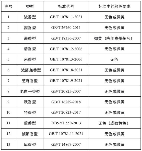 新修订的《白酒工业术语》和《饮料酒术语和分类》中对白酒的定义为“以粮谷为主要原料,以大曲、小曲、麸曲、酶制剂及酵母等为糖化发酵剂,经蒸煮、糖化、发酵、蒸馏、陈酿、勾调而成的蒸馏酒”,并没有给出对白酒颜色的要求。不过梳理每一香型白酒国家标准(或地方标准)的感官要求,可以大体将白酒的颜色分为三类:无色、无色或微黄、微黄。